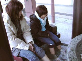 | ちょうど旅行に山中温泉を訪れていた親子づれも足ゆでのーんびり。 少し熱めのお湯なので最初はガマンですが、すぐになれてしまうでしょう。 10分も入っていると体中ポカポカです。 |