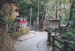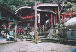 | 駐車場から杉林に囲まれた参道を十分ほど進むと右側に108段の石段があります。そこを降りたところに穴の谷の霊水の湧き出している薬師観音堂があります。 私が訪れた時は平日の午前中であった為ほとんど参拝者はいませんでしたが、休日にはポリタンクを一輪車に積んだ人達がひっきりなしに往復していると言う事です。 |