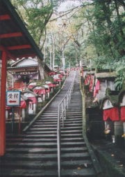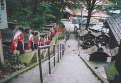 | 石段の途中に受付が有りますのでここで記帳します。20Lのポリタンク1つで100円必要です。 石段や参道の周辺には、この霊水を飲んで病気が治った事のお礼に立てられた観音堂が沢山有ります。 |