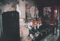 薬師堂の奥の洞窟から霊水が涌き出ています。 その昔、穴の谷の洞窟には白蛇が住むとして人々は近寄らなかったが、江戸時代の末期ごろから洞窟で修行する僧侶が増えて「行者穴」と呼ばれ、参拝者が訪れるようになった。 |