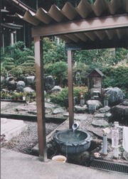 | 入り口の階段を上った右側に写真のような手水鉢にパイプから水が注がれていました。 水は地下30mから汲み上げているそうです。 カルシュウムが多く含まれていると書かれていました。 |