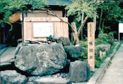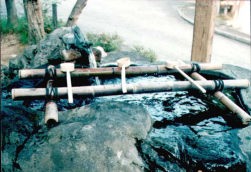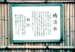 | 手水鉢に注ぐ水は水源を約3Km離れた鳩清水の滝。 約800年前砺波山で源平の合戦が繰り広げられ、木曽義仲は倶利伽羅山へ軍を進めたが水がなくて苦戦をしいられた。その時、白い鳩がやって来て滝に案内したという。 |