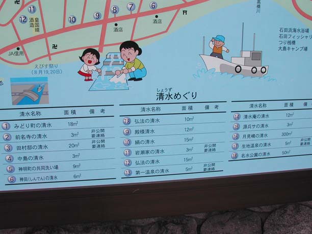 町のあちらこちらにある清水の案内板です。 写真をクリックすると大きくなります。 |