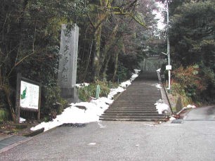 | 国道415号線を氷見から伏木方面へ進み、雨晴らし海岸を過ぎます。伏木高校前からしばらく行くと気多神社口の信号が有ります。右折してしばらく進むと写真のような気多神社の石段が見えてきます。 気多神社のある伏木は、万葉の歌人「大伴家持」が越中の国守として赴任してきた土地。境内には大伴家持を祀った大伴神社もあります。 |