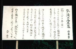 | 約1200年前日照りが続いた時の事、村人たちは飲料水もなく悪疫が流行し大変困っていた。 そこへ訪れたみすぼらしい旅の姿のお坊さんが、一生懸命に泉を掘ってくれた。村人たちは、ほどなくその旅のお坊さんが弘法大師だとわかり、御恩報謝のお堂を建てた。 |