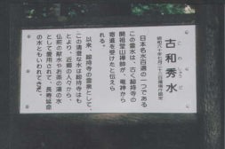 | 古和秀水の名前の由来は、「鬼屋に住む弥一の父が不思議なことに毎晩酔って帰ってくる。弥一は真相を確かめようと父の後をつけたところ、畑仕事が終わった父は、近くの湧水をうまそうに飲みはじめた。するとすぐに上機嫌になり酒に酔ったようになった。 父が立ち去ってから弥一も飲んでみたが普通の冷水だった。」ということで「親は酒々、子は清水(しゅうど)」が語り継がれ、後に古和秀水と漢字で書くようになった。 |