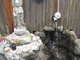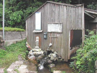 | 小屋の奥から多くの水が流れ出していました。 その一部がパイプからも流れ出していて、汲みやすくなっています。 手前にはお地蔵様もあります。 今でもこの水を使って町野町の豆腐屋が豆腐を作っているようです。近所の人たちが野菜を洗うのにも使われています。 夏の日照りにも枯れたことがなく水量は豊富で冷たくおいしい水が湧き出していました。 |