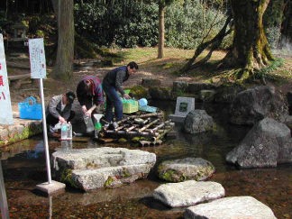 | 大木に囲まれた静寂な中に岡の清水は有ります。道が狭いので車の駐車はご近所の迷惑にならないよう十分注意しましょう。この日も多くの人が水汲みに来ていました。 | |