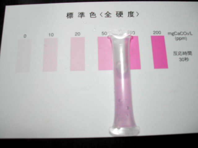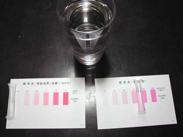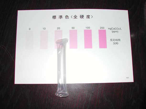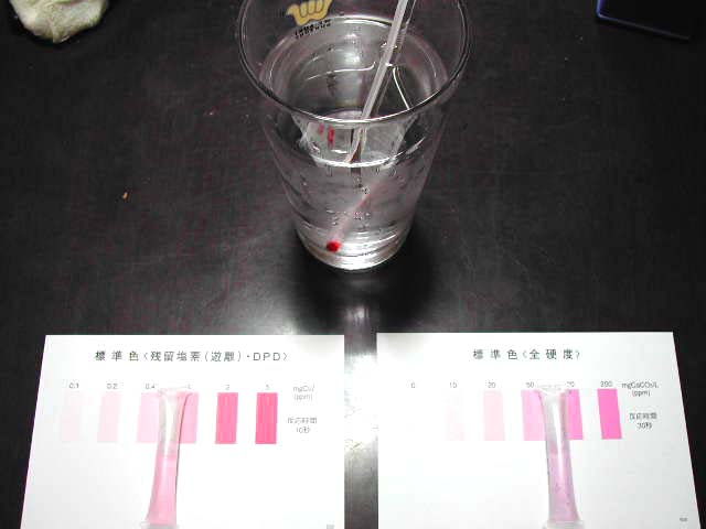 | 水のおいしさ: | 水のおいしさの条件としては、全硬度、残留塩素、ミネラル、温度や炭酸ガス、酸素などが上げられます。 比較的簡単に測定できる温度、全硬度、残留塩素のテストを行ってみました。 その他に無色、透明、無臭など人の感じ方や体調による要素が大きいと言えると思います。 |