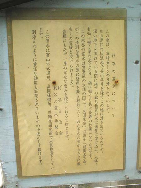 | この水は高速道路の脇から毎時5トン余りが湧き出しています。立山連邦の伏流水で長い年月を経てこの地に湧き出しているのです。深い地下を流れている間に地価の鉱石物質が水に適量に溶け込み、人体に有効に働く薬の水となり、病に効くと共に長寿の妙薬になったのです。 この水は富山市水道局、高岡保健所、県衛生研究所で水質検査を行った証明書も付いています。 |