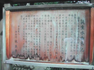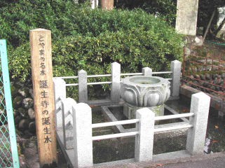 | 由来は約600年前に法華宗の開祖、日隆聖人がこの地に誕生した。 その折、生家である浅井城の前庭に水が湧き出し、それを汲み取って聖人の産湯としたことから「誕生水」と呼ばれるようになった。 水は様々な病気によいとされ、特に昔から眼病に効くと言われている。 |