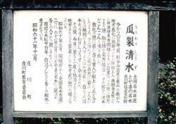 600年ほど前に井波瑞泉寺の開祖、しゃく如上人が庄川で休憩されたおり、馬のひずめが突然陥没してその跡から清水が湧き出した。さっそく里人が献上した瓜を冷やしたところ、あまりの冷たさのために瓜が自然に裂けたところから、瓜裂清水と名付けた。 |