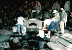 | 年中12、3度と一定した水温で水量は多く、沢山の人が酌みにきていました。 水を酌んでいたお母さんに話を聞くと、ご飯を炊くと大変おいしいそうです。 |