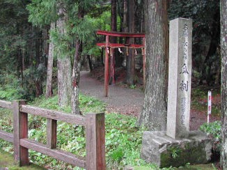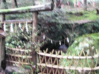 瓜割の滝は、この森の中ほどの木立に囲まれた岩場から湧き出している。 落差2m程の小さな滝となって、水苔に覆われた岩の間を流れ下流の村へと続いています。 湧き出し口は鳥居が立てられ、しめ縄が張られています。(日中なのに、余りにも暗くて写真がぶれてしまいました。ゴメンナサイ) |