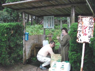 | 水汲み場は入り口の駐車場付近に2箇所あります。 管理組合で発行しているシールを貼った容器にだけ水を汲むことが出来ます。 この日も関西方面からたくさんの人がポリタンクを持って水汲みに訪れていました。 瓜割の名は、湧水のあまりの冷たさに冷やした瓜も割れてしまったと言う「瓜割伝承」に由来するもので北陸地方に多く見られるものです。 |