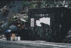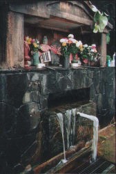 お地蔵さんの祠の下から豊富な水が流れ出ています。 私が訪れた時は天候が雪であまり良くなかったのですが、多くの人が水汲みに来ていました。 |