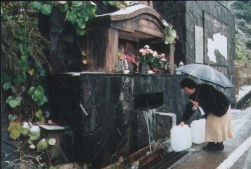 | 水汲みに来ていたお母さんに聞いてみると「この水は肝臓の悪い人に効く。お酒を飲みすぎて肝臓を悪くした人に良いようです。」と言っていました。 利賀村へ向かう国道471号線は曲がりくねった崖の多い細い道です。ドライバーは非常に神経を使うところに在り、お地蔵さんと水汲み場は良い休憩場となっています。お地蔵さんには、旅の無事と交通安全の願いが込められています。 |
